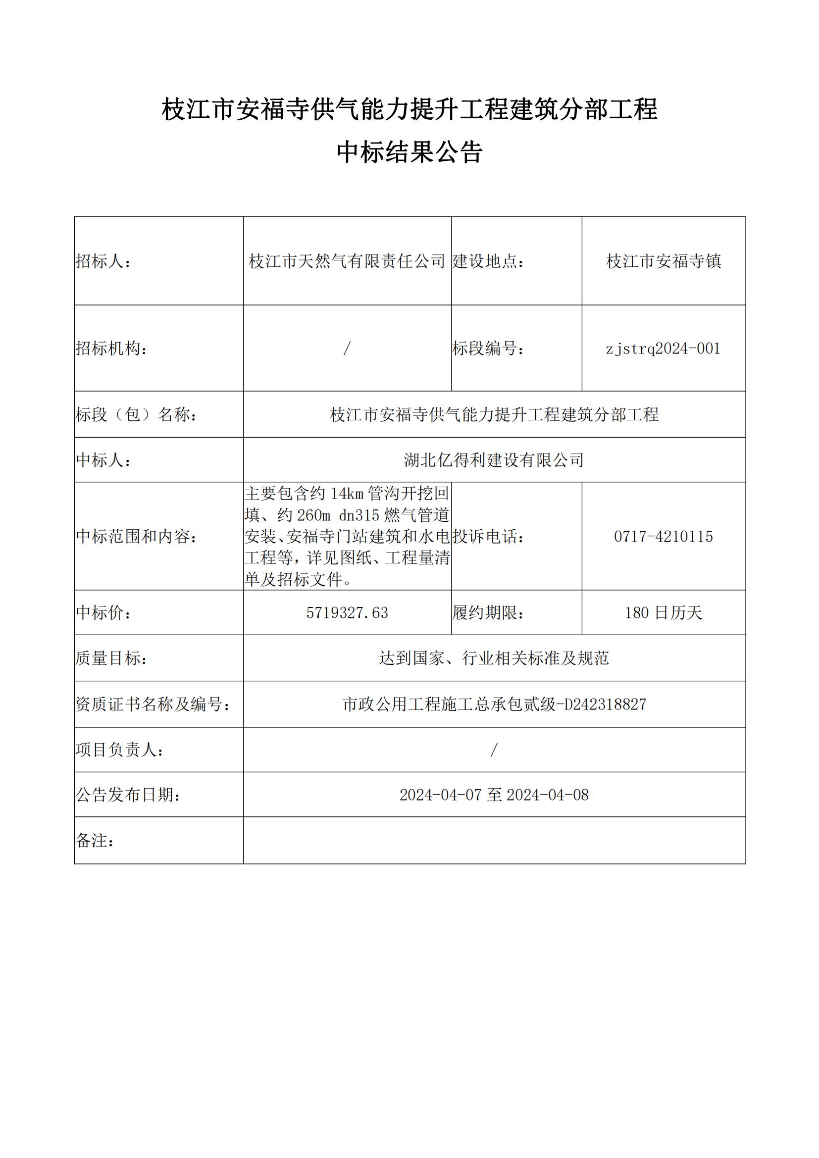 枝江市安福寺供氣能力提升工程建筑分部工程中標(biāo)結(jié)果公告