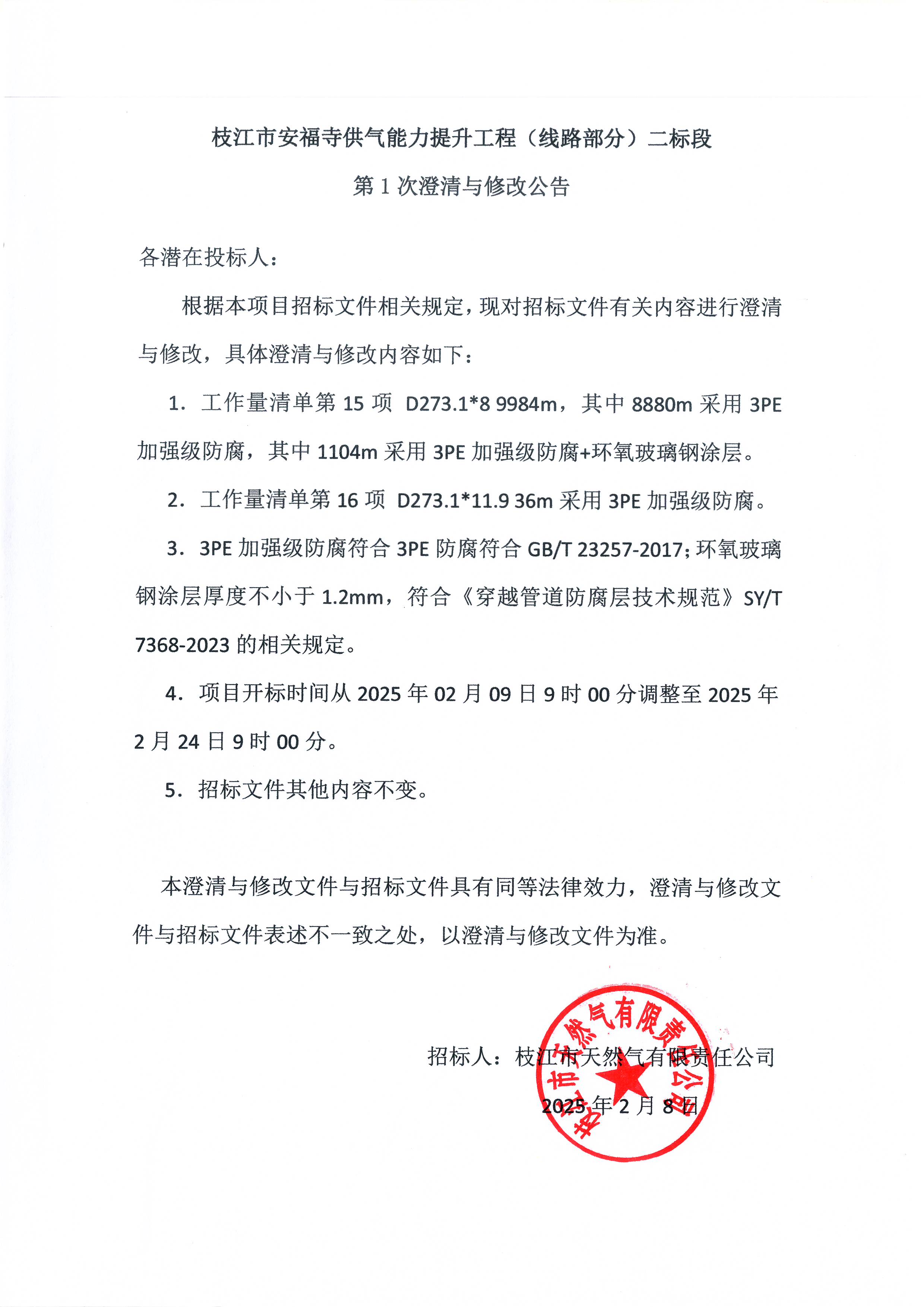 枝江市安福寺供氣能力提升工程(線(xiàn)路部分)二標(biāo)段第1次澄清與修改公告