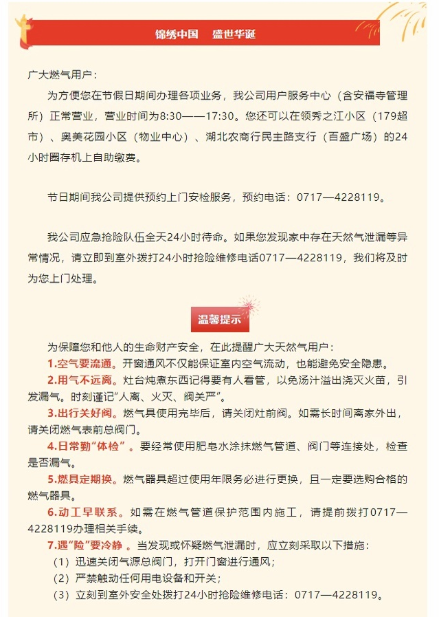 假期我在崗 服務不打烊——枝江市天然氣公司國慶期間營業(yè)時間公告