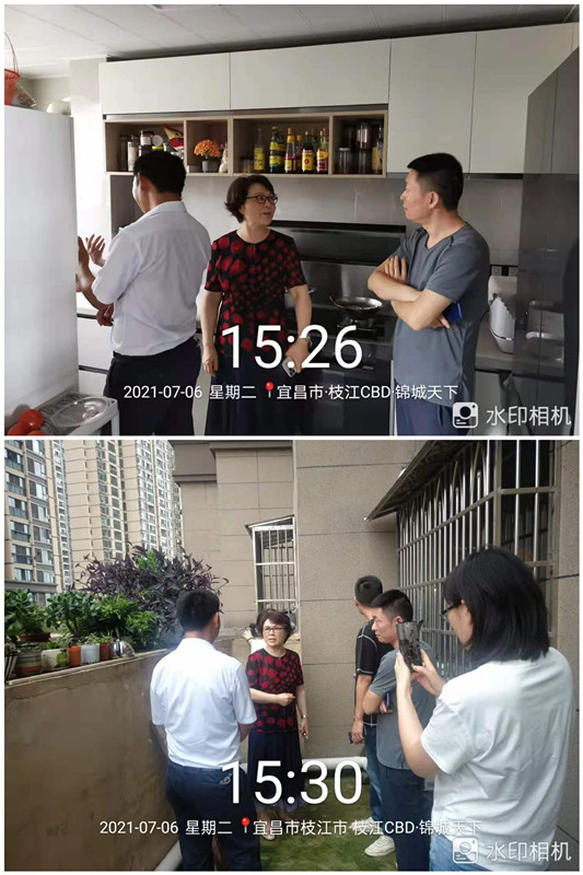 7月6日下午,胡華瓊董事長再次到現(xiàn)場勘察錦城天下小區(qū)2棟臨街煙道占壓燃氣立管的問題,并協(xié)調(diào)開發(fā)商整改。