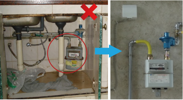 ④燃?xì)獗硖幱诔睗裎恢?/span> 。整改建議:保持燃?xì)獗砑爸苓吀稍?,或移表改管?/span>