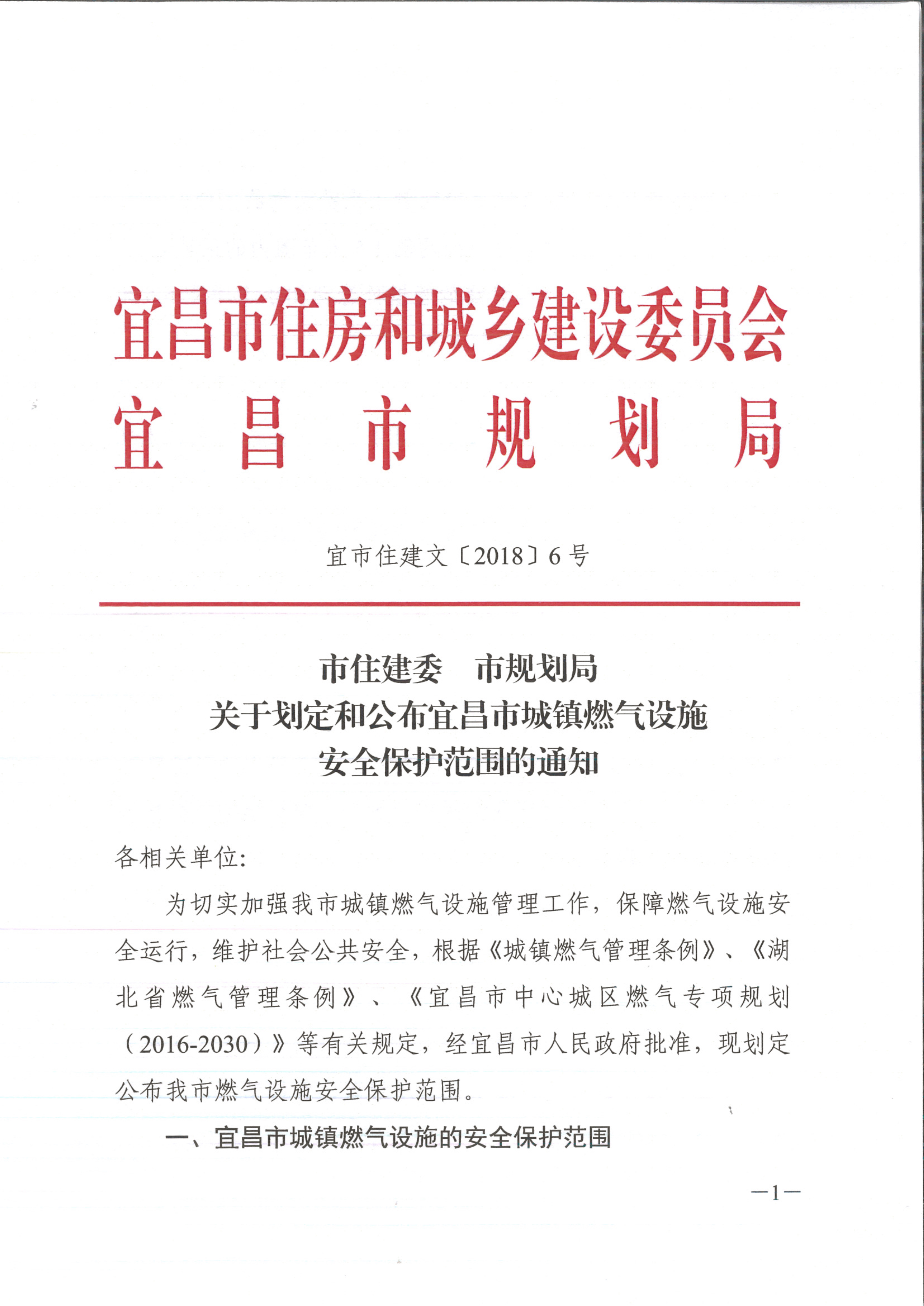 關(guān)于劃定和公布宜昌市城鎮(zhèn)燃氣設(shè)施安全保護范圍的通知