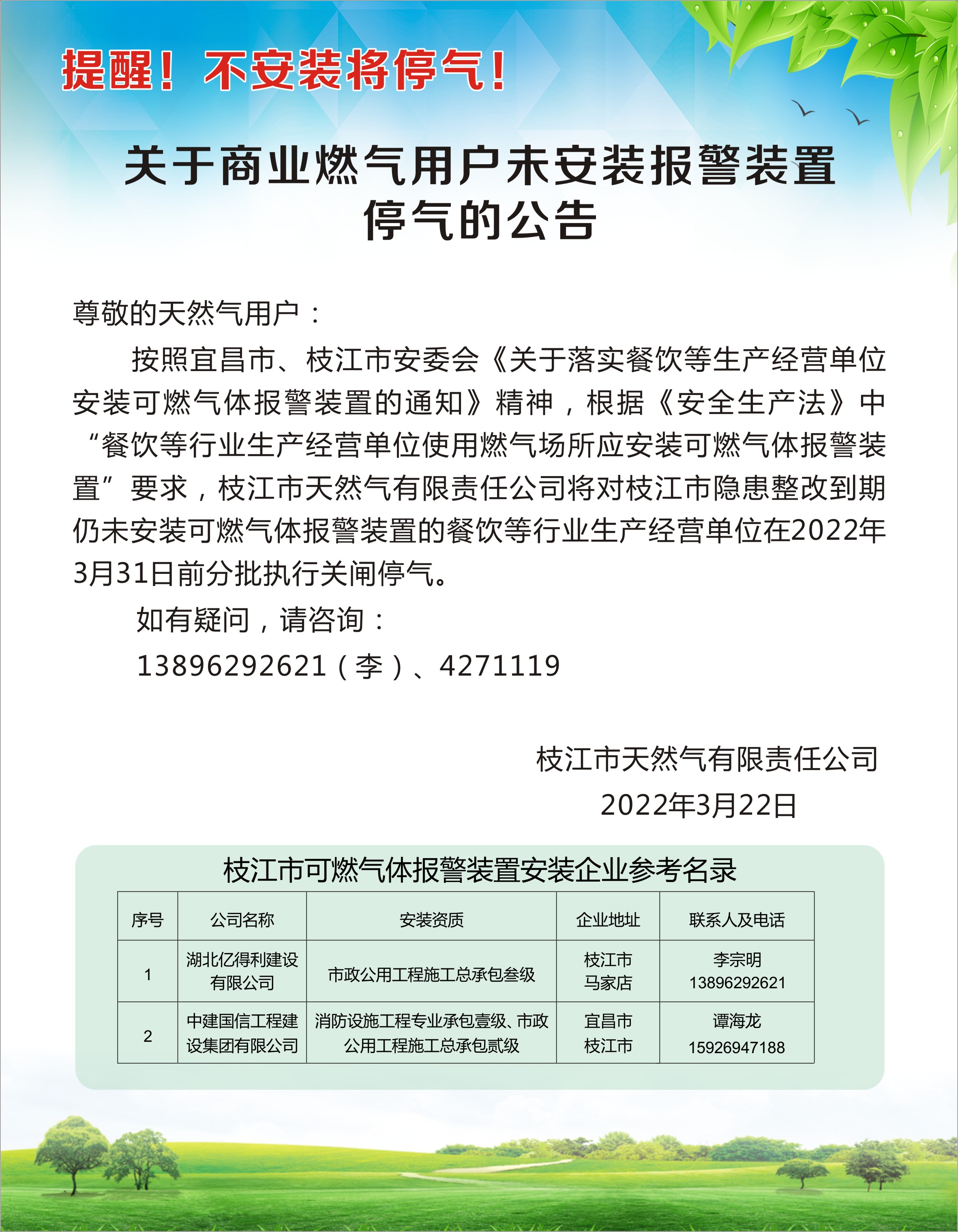 關(guān)于商業(yè)燃氣用戶未安裝報警裝置停氣的公告