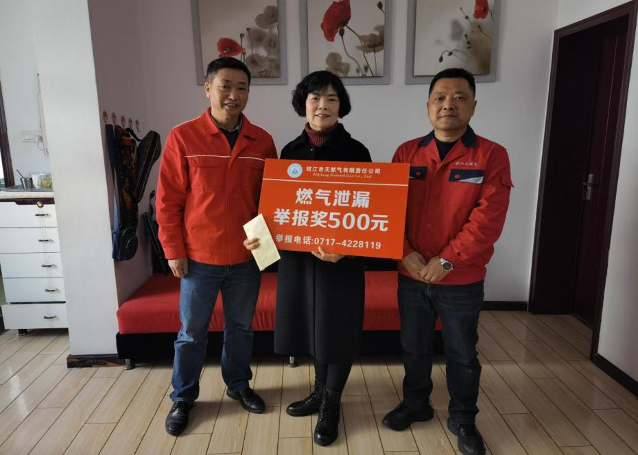 2022年3月24日上午,公司安全總監(jiān)王林同志到團結(jié)路老技校小區(qū)3號樓1單元201室,將500元獎金當面呈送熱心市民徐發(fā)桂,感謝她在發(fā)現(xiàn)燃氣泄漏后及時報警,使得搶險及時,阻止了更大次生事故的發(fā)生。徐發(fā)桂同志也成為枝江市2022年首位獲得燃氣安全隱患舉報獎勵的熱心市民。
